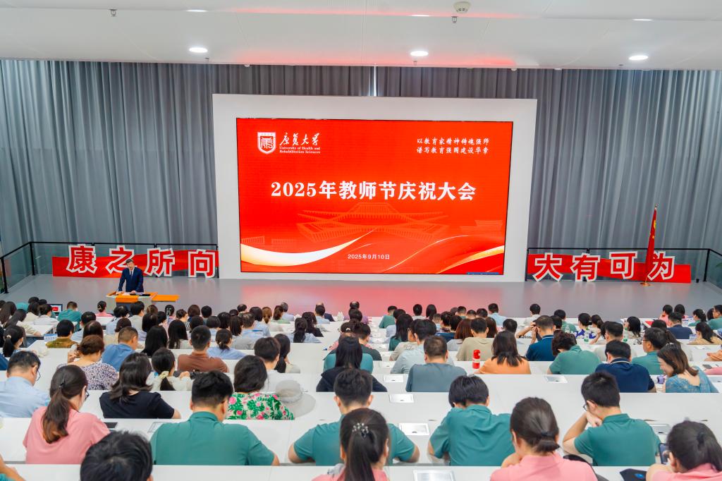 校长董尔丹发表教师节庆祝大会致辞,代表学校向全体教职医护员工致以节日的祝福和问候。他指出,作为中国第一所以健康促进为核心、在生命健康领域唯一的新型研究型大学,我们必须要回答好“健康中国2030”这张考卷,提供好生命健康促进的康大方案。希望全体教职医护员工要牢记“为党育人、为国育才”的初心使命,在三尺讲台以仁爱之心点亮学生人生道路,在实验室里以严谨之志探索康复科技前沿,在医疗一线以精湛之术守护生命健康平安,在服务岗位以奉献之心保障学校顺畅运行。希望全体教职医护员工要勇担“赋能失能以使能”的康复使命,坚守“让失去的被重新拥有,让受伤的仍被世界温柔以待”的康复情怀,做有康复情怀、高深学识、育人智慧、责任担当的好老师,将生命健康促进的康大方案做成我们献给世界,也献给自己的终身成就奖。